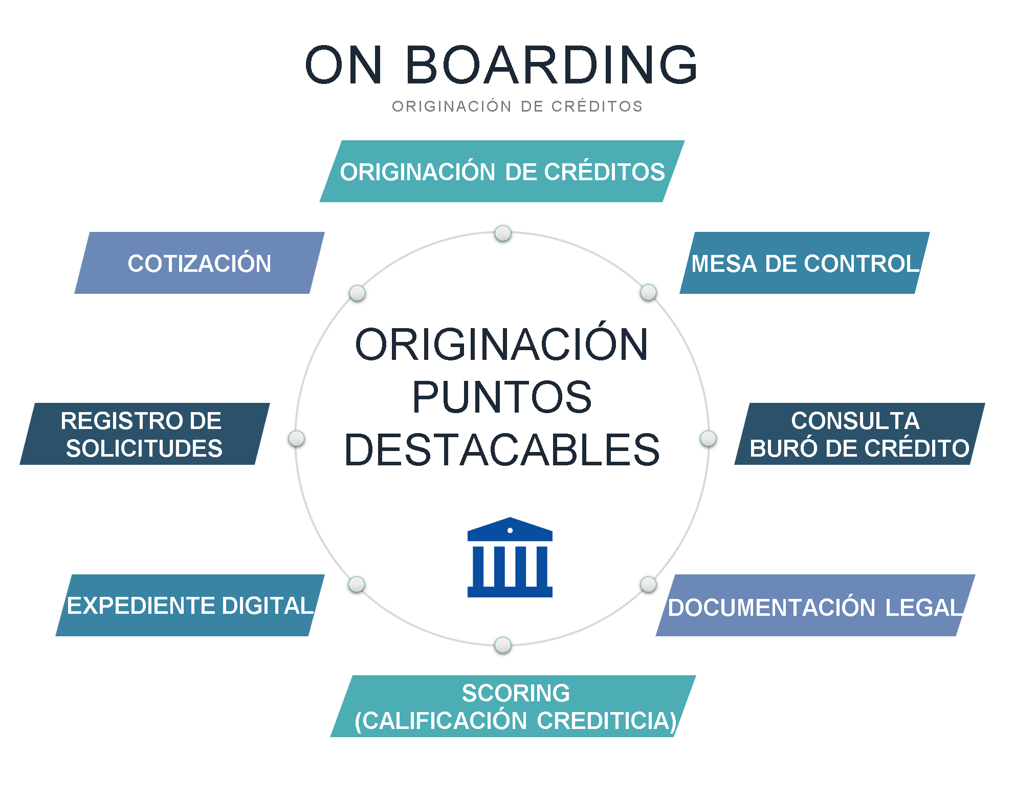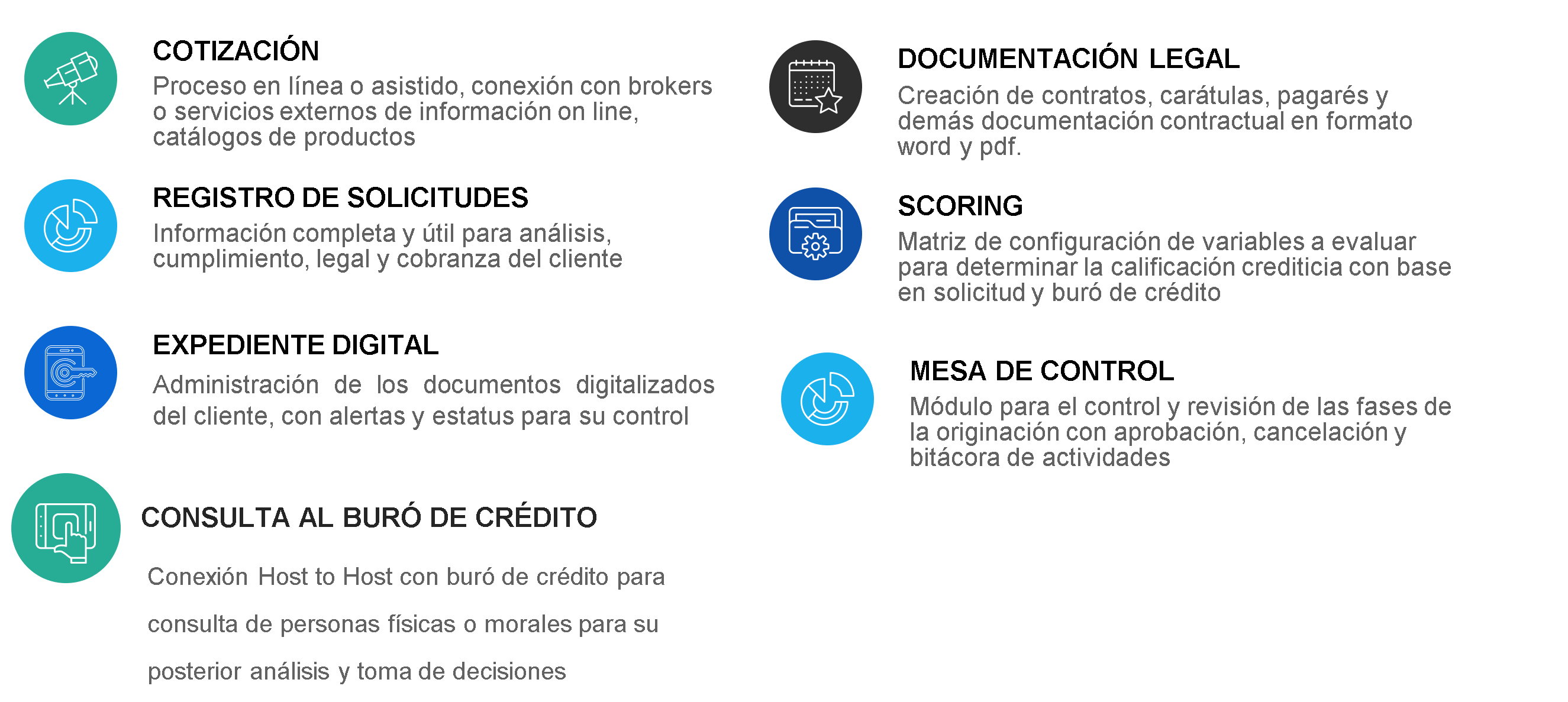 Integra las actividades de flujo completo desde la recepción de una solicitud de crédito hasta la formalización de la misma, obedece a las configuraciones propias de cada institució